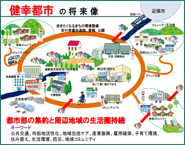 そこで、適切な居住密度を維持できる市街地ゾーン、将来市街地ゾーンに対応する公共交通のあり方及び将来市街地ゾーンに対応する拠点地区のあり方についての具体的な検討が必要となり、その解決のため、本市では「地方都市の過度の車依存から脱却して、歩いて暮らせる健幸コンパクトシティの形成」を目指し、都市部も周辺地域も持続可能なまちづくりを進めることとなった。